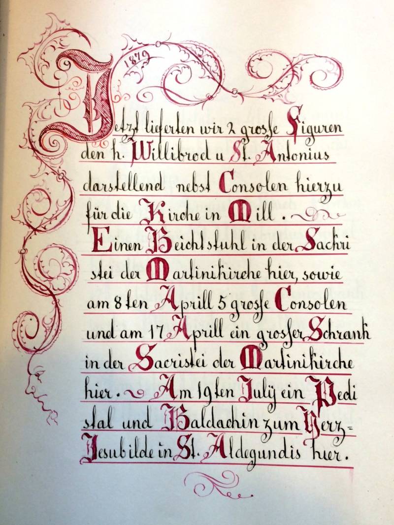 Hier beneden enkele Pagina' s uit het Duitse Boek van dhr. Jo van Soest over de leverantie door Atelier Kirchenarbeiten van Gebr. Endlich in Emmerich in 1879, dat speciaal artikelen aan Kerken leverde. Aan de Willibrorduskerk in Milll werden 2 grote beelden geleverd; één voorstellend St. Willibrord en één voorstellend St. Antonius, beiden met bijbehorende consoles.