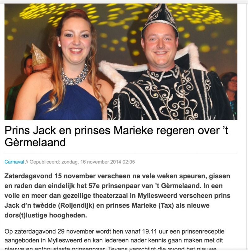 Hier beneden de Prinses Carnaval mevr. Marieke Tax en Prins Carnaval Prins Jack den Twedde, Carnaval 2015 dhr. Jack Roijendijk. Bronvermelding: inmill.nl