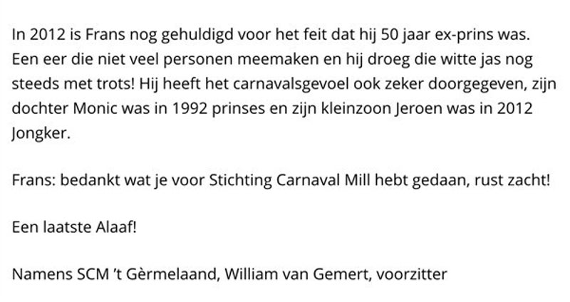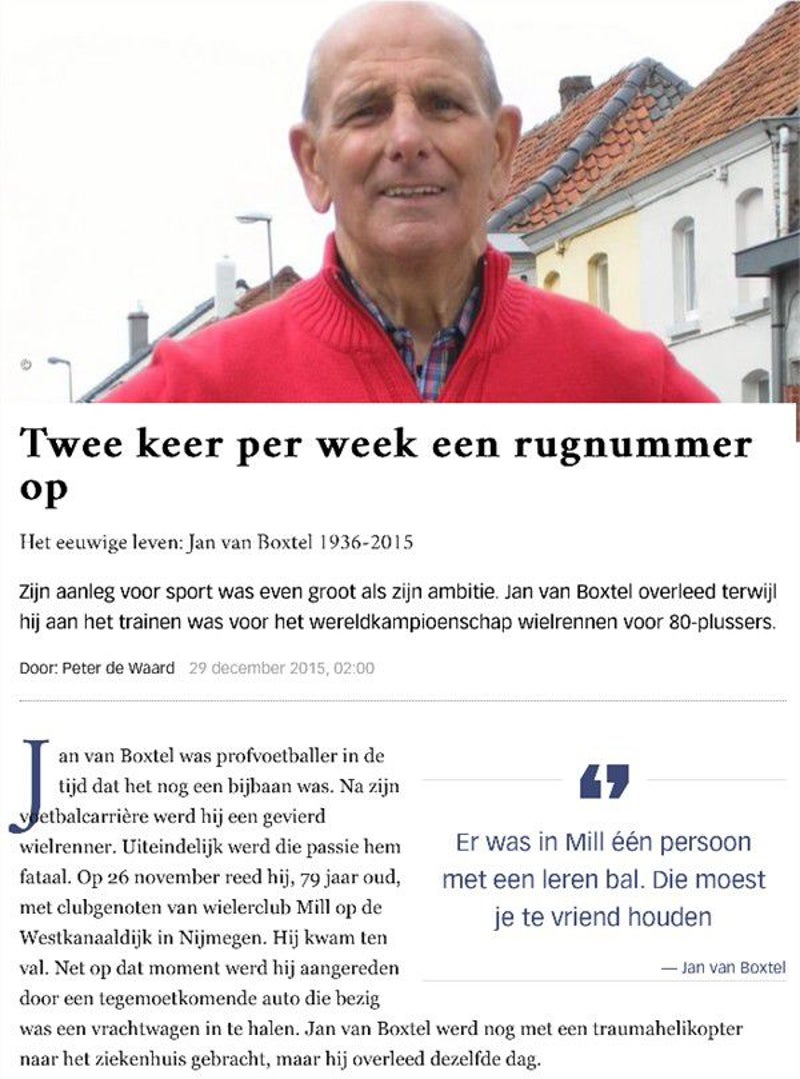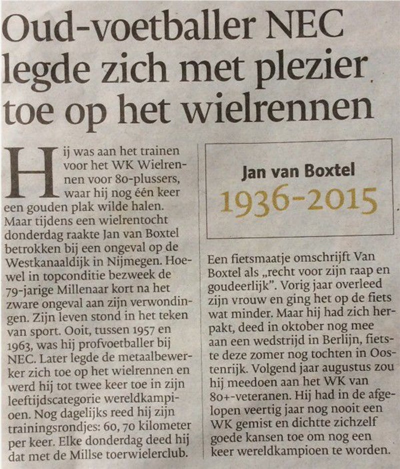 Hier beneden een artikel in de Neije Krant betreffende het trieste Overlijden van de Millse Oud Marinier op Curaçao, Prof-Voetballer bij N.E.C. en Wereldkampioen Wielrennen voor Senioren, dhr. Jan van Boxtel op 26 november 2015. Dhr. Jan van Boxtel had behalve zijn vele hobby's o.a. als Wielrenner ook nog de hobby om als Vrijwilliger computerles te geven aan de Computercursus voor Ouderen in Mill en daar zijn wij Jan héél dankbaar voor.