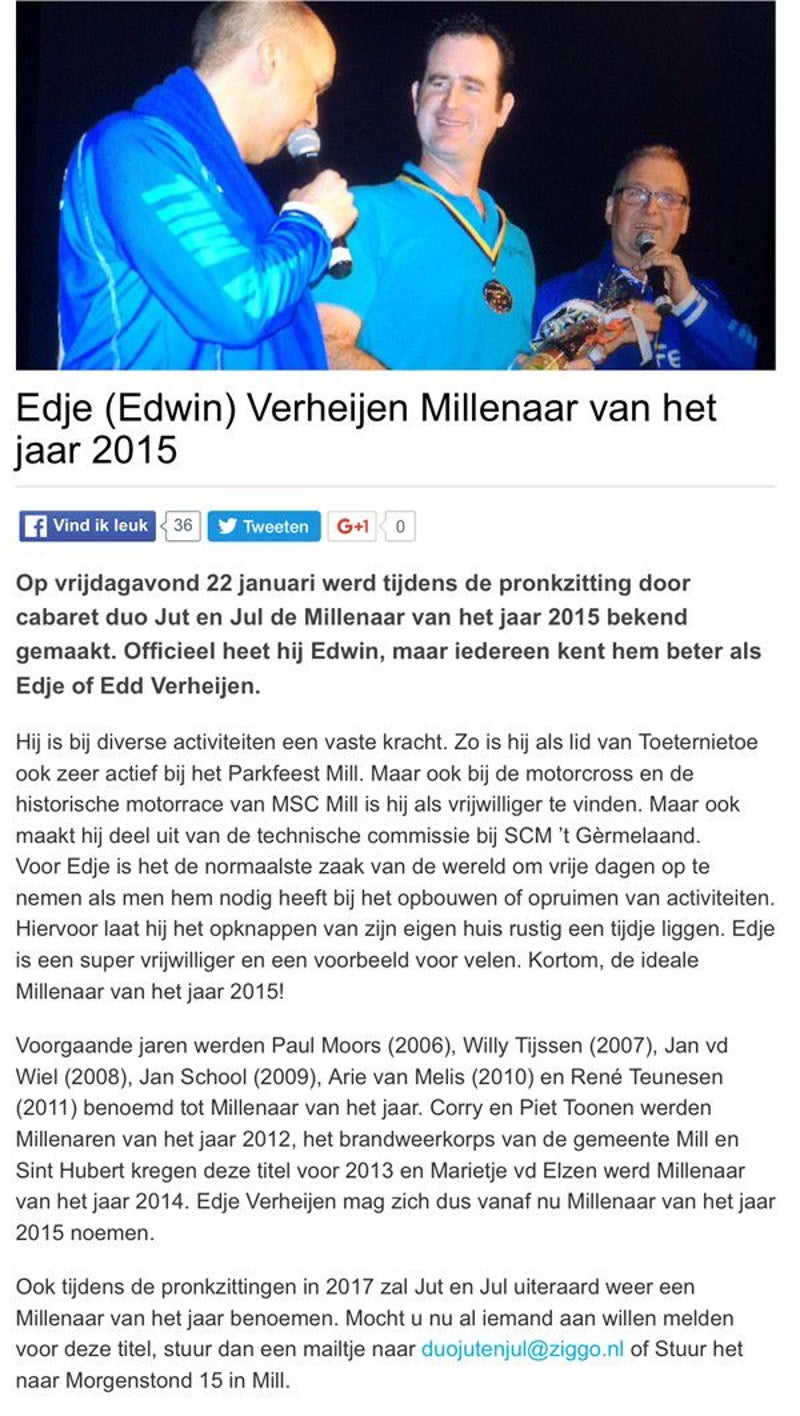 Hier beneden de benoeming tot Millenaar van het Jaar 2015