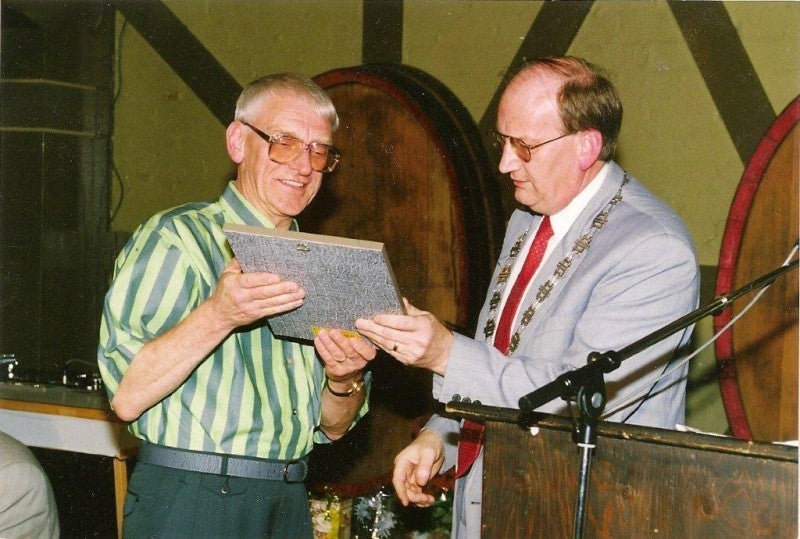 Ere-Burgers Mill: Er zijn 2 Ere-Burgers in Mill. Mevr.J. Konings-van Eekelen en dhr. Frans Keurentjes. Hier al vast een foto van Henk van de Weem betreffende de uitreiking van de Millse onderscheiding door Burgemeester Daandels aan dhr. Frans Keurentjes als Ere-burger van Mill.