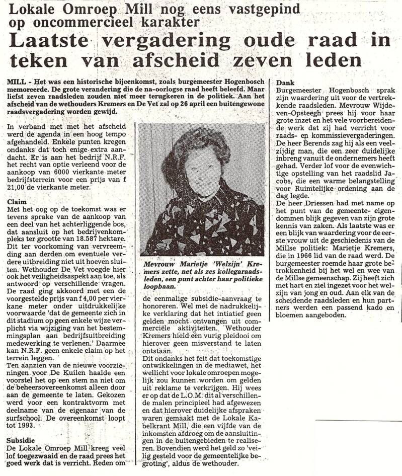 Hier beneden een krantenartikel in de Gelderlander over Het Afscheid van Leden van de Millse Gemeenteraad, waaronder mevr. Marietje Kremers en 6 collega-raadsleden in een uitzending van de Lokale Omroep Mill de L.O.M.