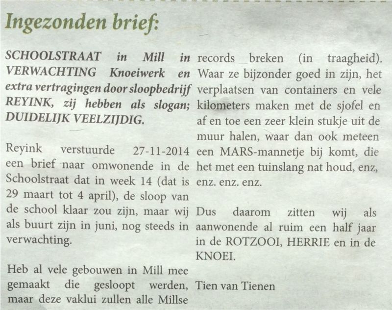 Hier beneden een foto anno 2015 over het opnieuw verwijderen van alle Bomen aan weerszijden van de Schoolstraat. In heel Mill werden in 2015, vergezeld van ambtelijke SMOESJES, bijna alle bomen weggehaald en Amsterdammertjes geplaatst.