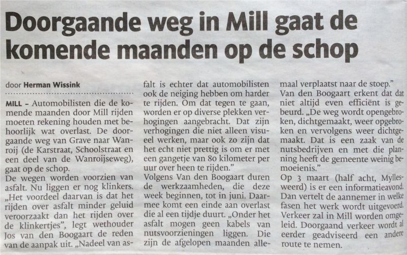 Op deze Pagina heb ik al verschillende foto's van Millse-Wegreparaties geplaatst, maar er zijn er nog vele foto's van. Wegen die bijna elk jaar aangepast worden. Zeker voor ondernemers aan de Wanroijseweg, Schoolstraat, Karstraat, is het een HEL. Mill lijkt meer een Opleidingscentrum voor wegenbouwers waar vroeger de strengste leraar dhr. Gerrit van den Oetelaar was.De Paaltjes d.w.z. "AMSTERDAMMERTJES" die met honderden in Mill geplaatst werden staan overal in de weg. Dhr. Tien van Tienen had er zelfs een Thema van gemaakt in een Carnavalsoptocht ( zie de Pagina Carnaval Mill ). Nu gaat Schijndel de zaken in Mill aanpassen. Hadden we in Mill maar een paar Oude PANDEN gerestaureerd, we zijn toch op een na de Duurste Gemeente van Nederland.