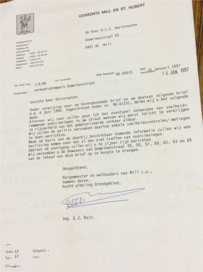 Op 9 augustus 1979 kocht de Gemeente Mill c.a. van de hele fam. Verstraaten een stuk grond dat in de Burgemeester Verstraatenlaan lag en dat tot 1979 toe nog Eigendom was van de Familie Verstraaten. De Verstraatens hadden aan de Zusters Franciscanessen de Grond gegeven voor de bouw van het Nonnenklooster aan de Burgemeester Verstraatenlaan. Zie hieronder een van de Volmachten aan Christine Verstraaten-Coenen, de echtgenote van Hub. Verstraaten.