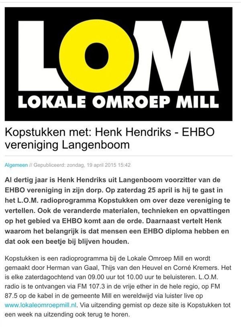 Hier beneden een artikel in de Neije Krant over het Interview met dhr. Henk Hendriks, de voorzitter van de E.H.B.O. in Langenboom op de L.O.M. op Zaterdag 25 april 2015.