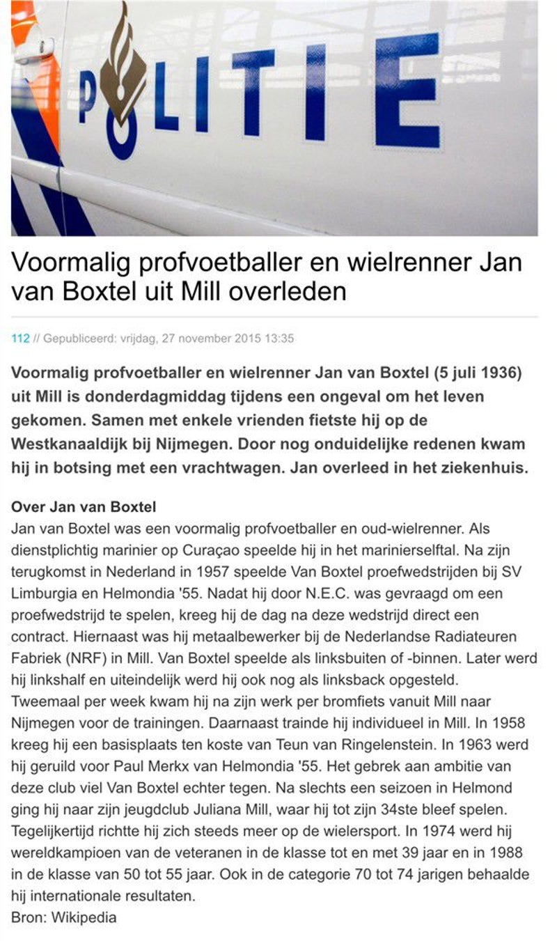 Hier beneden een artikel in de Neije Krant betreffende het trieste Overlijden van de Millse Oud Marinier op Curaçao, Prof-Voetballer bij N.E.C. en Wereldkampioen Wielrennen voor Senioren, dhr. Jan van Boxtel op 26 november 2015. Dhr. Jan van Boxtel had behalve zijn vele hobby's o.a. als Wielrenner ook nog de hobby om als Vrijwilliger computerles te geven aan de Computercursus voor Ouderen in Mill en daar zijn wij Jan héél dankbaar voor.