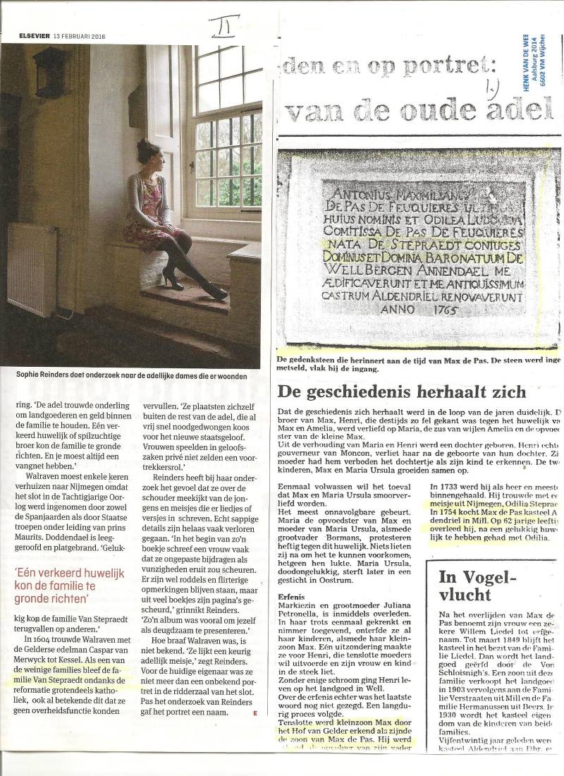 Beste PIETER en JANNEKE, voor jullie heb ik morgen in petto : familie VON STEPREADT, zoals die in Elsevier is weergegeven als beheerder van Kasteel Doddendaal bij Ewijk. Op de herinneringssteen van Aldendriel staat ODILIA van Stepraedt genoemd eind 18de eeuw. Ook Kasteel Hernen en zelfs Batenburg hebben met een bepaalde tak te maken. Echt iets voor Janneke om uit te zoeken, wat de connecties met Mill waren. “een keurig adellijk meisje” heet het artikel. Groeten, Henk van de Weem. .
