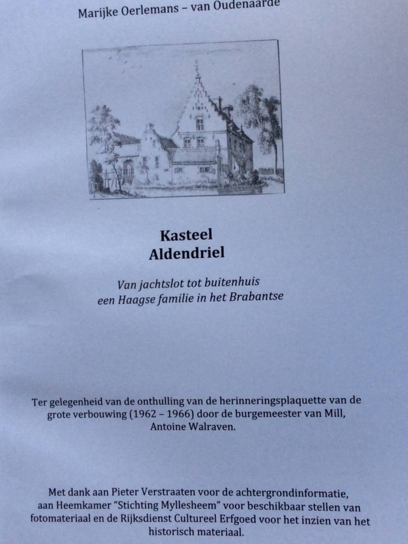 Hier beneden een email van Mevr. Marijke Oerlemans van Oudenaarde, de moeder van dhr. Reinout Oerlemans over een boek wat ze wil gaan schrijven over het leven van haar ouders in Kasteel Aldendriel in Mill en de plaatsing van een Gevelsteen in Kasteel Aldendriel op 4 augustus 2018.