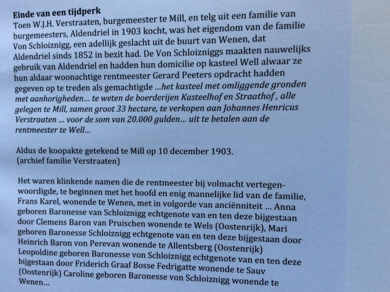 De familie Verstraaten was rentmeester voor de Liedels van de Millse goederen waaronder Aldendriel. Door Anna Eleonora komen de bezittingen van Petrus Wilhelmus de Liedel aan de Schloissniggs. Frans Baron de Schloissnigg, geboren in 1807, huwt in 1842 met Augusta Baronesse von Pilgram en wordt heer van Aldendriel. Zijn zoon Frans Seraph. Joh. Baptist, geboren op 18 november 1842, gehuwd met Sophie Gravin Cavriani (geboren op 4 november 1847), volgt hem op. Deze verkopen de Wellsche en Millse goederen in 1903.