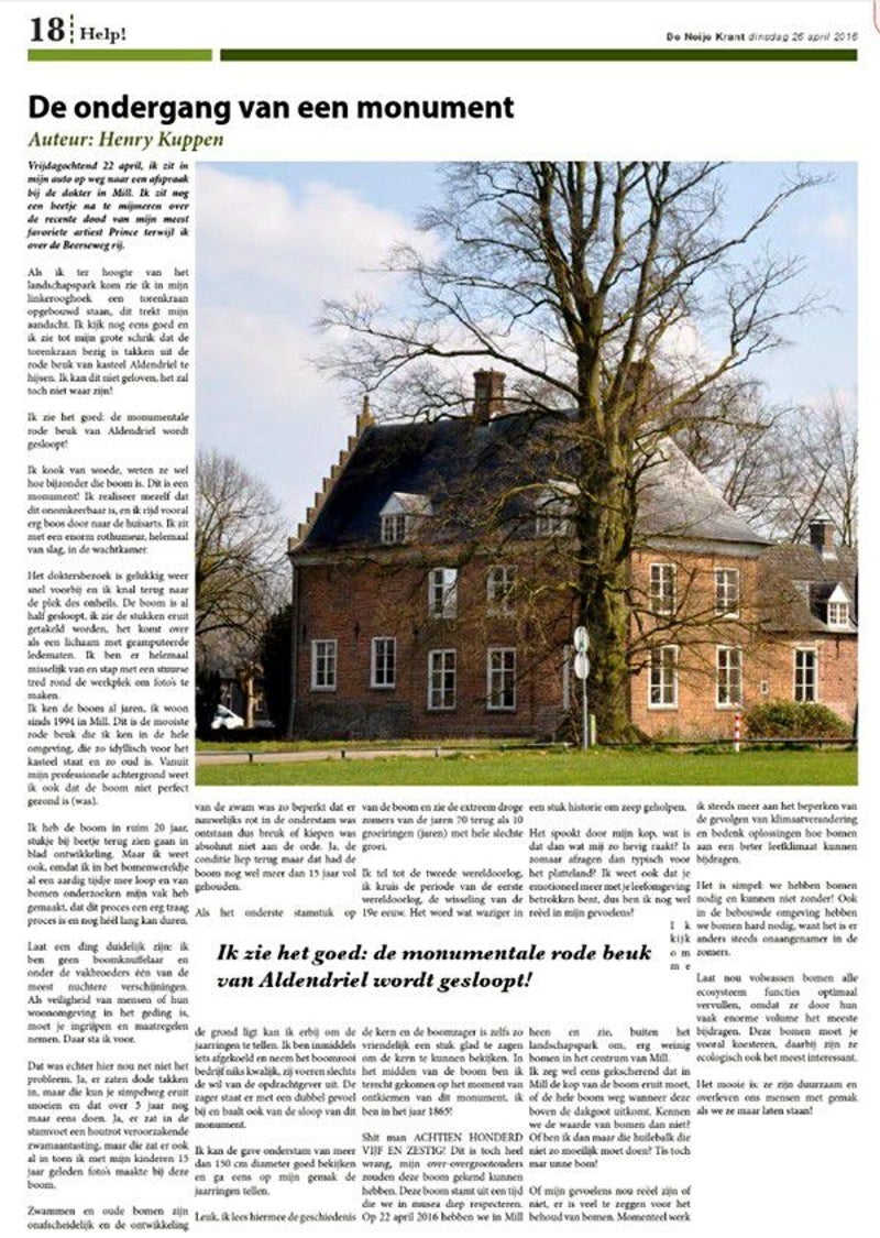 Hier beneden een Artikel dd. 26 April 2016 in De Neije Krant van dhr. Henry Kuppen, Boomspecialist van Beroep, over het Kappen van de Monumentale Beuken-Boom voor Kasteel Aldendriel.