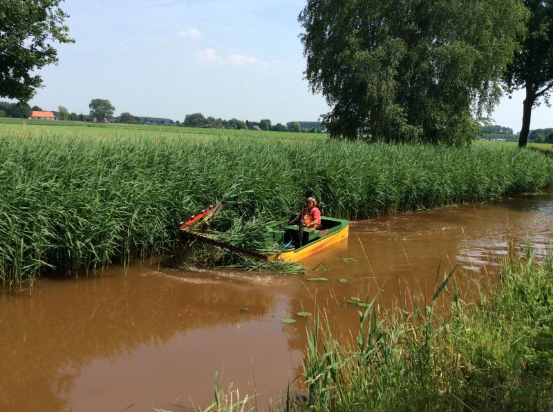 Hier beneden een medewerker van het Waterschap "AA en MAAS" bezig met het schoonmaken van de Rivier de Raam.