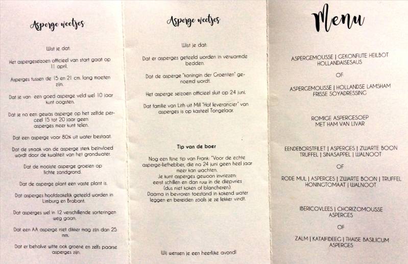 Hier beneden het Menu tijdens het Asperge-seizoen in Kasteel Tongelaar.