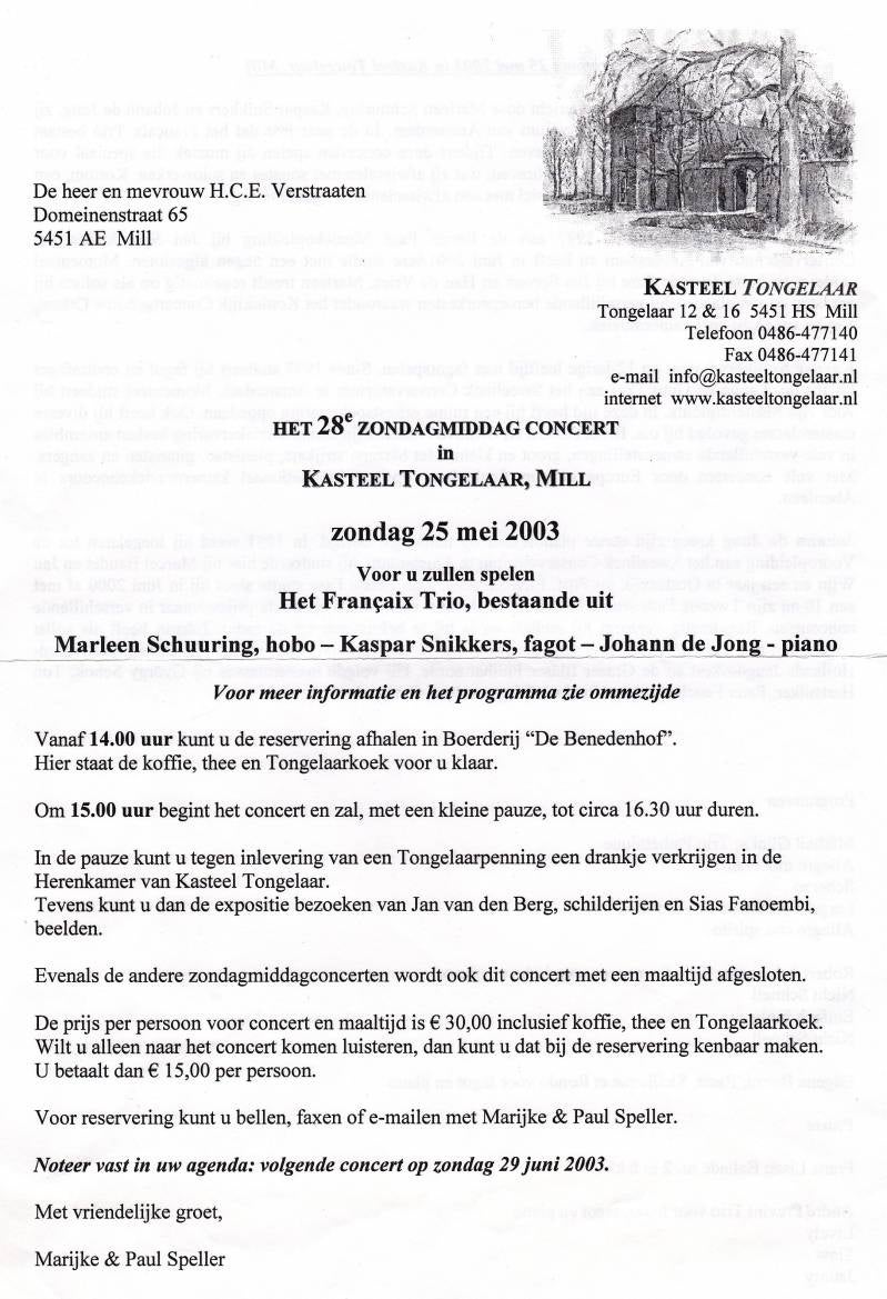 Hier beneden het 28e Zondagmiddagconcert op Kasteel Tongelaar van mevr. en dhr. Marijke en Paul Speller in 2003.
