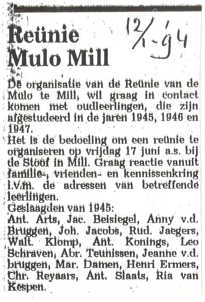 Dag Pieter Verstraaten dat klopt inderdaad, Christiaan was jonger dan wij, heeft wel met ons onder de oorlog bijles gekregen van Meester Claassens en sloeg daardoor de 5de klas over. Na de 6de klas gingen wij naar de ULO en is Christiaan waarschijnlijk naar een internaat gegaan. Hij heeft dus NIET bij mij in de 1ste klas gezeten in 1941. Ik zal de lijst van mijn leeftijdgenootjes eens raadplegen. 1934 en 1935 heb ik ooit van de gemeente Mill gekregen.