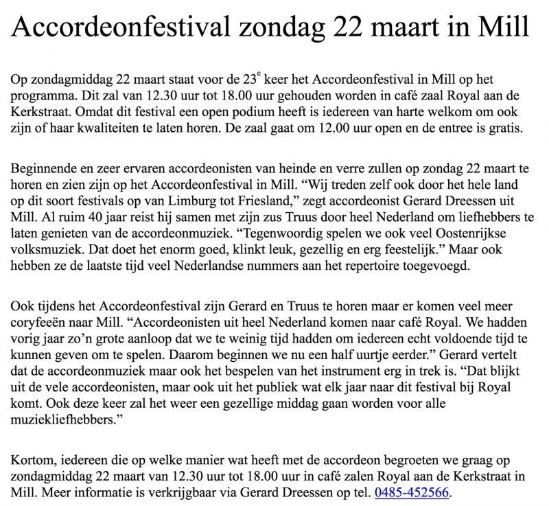 Hier beneden info over het Accordeonfestival op 22 maart 2015 bij Grand Café Royal met de Millenaren Mevr. Truus en Gerard Dreessen.