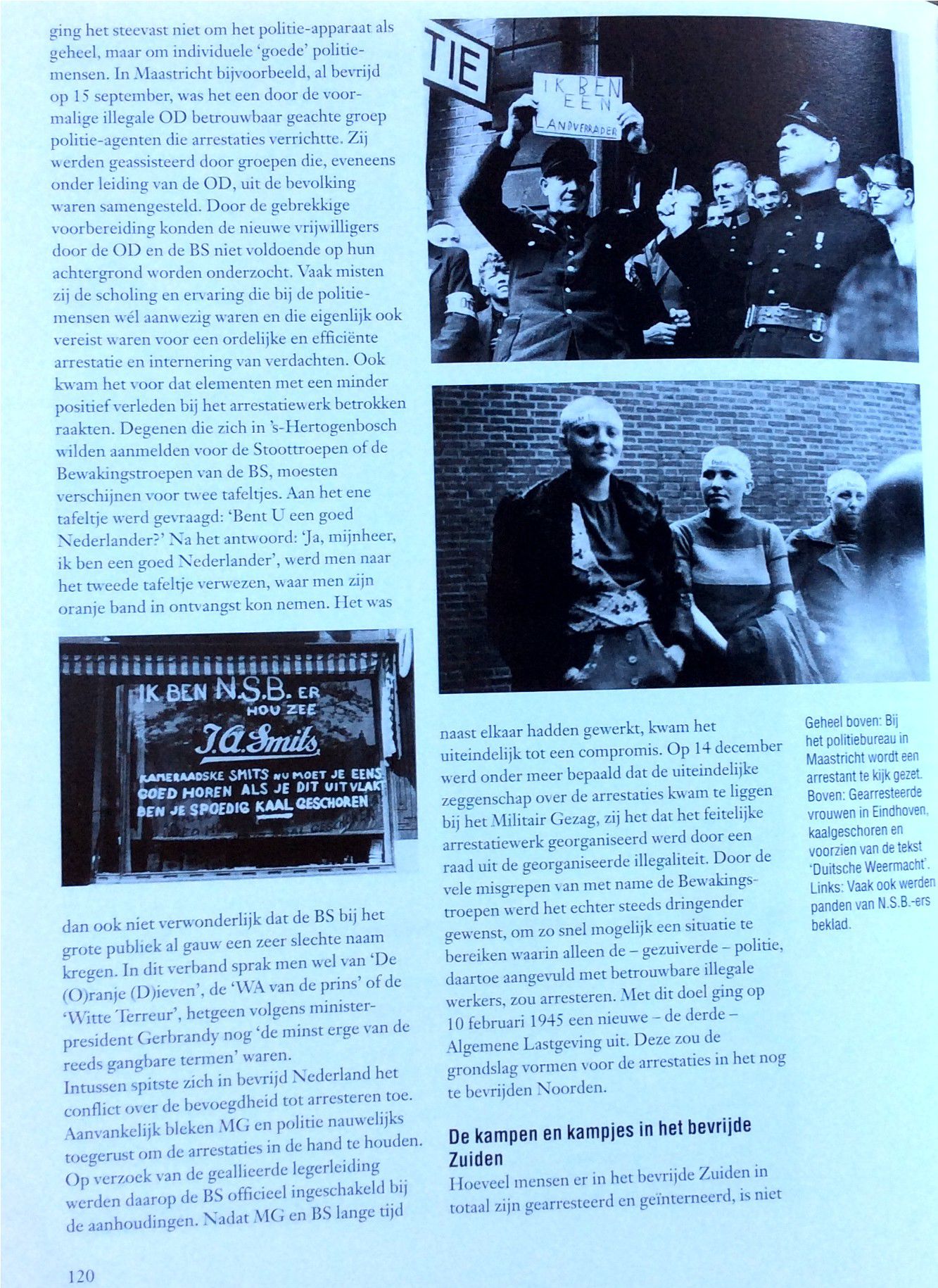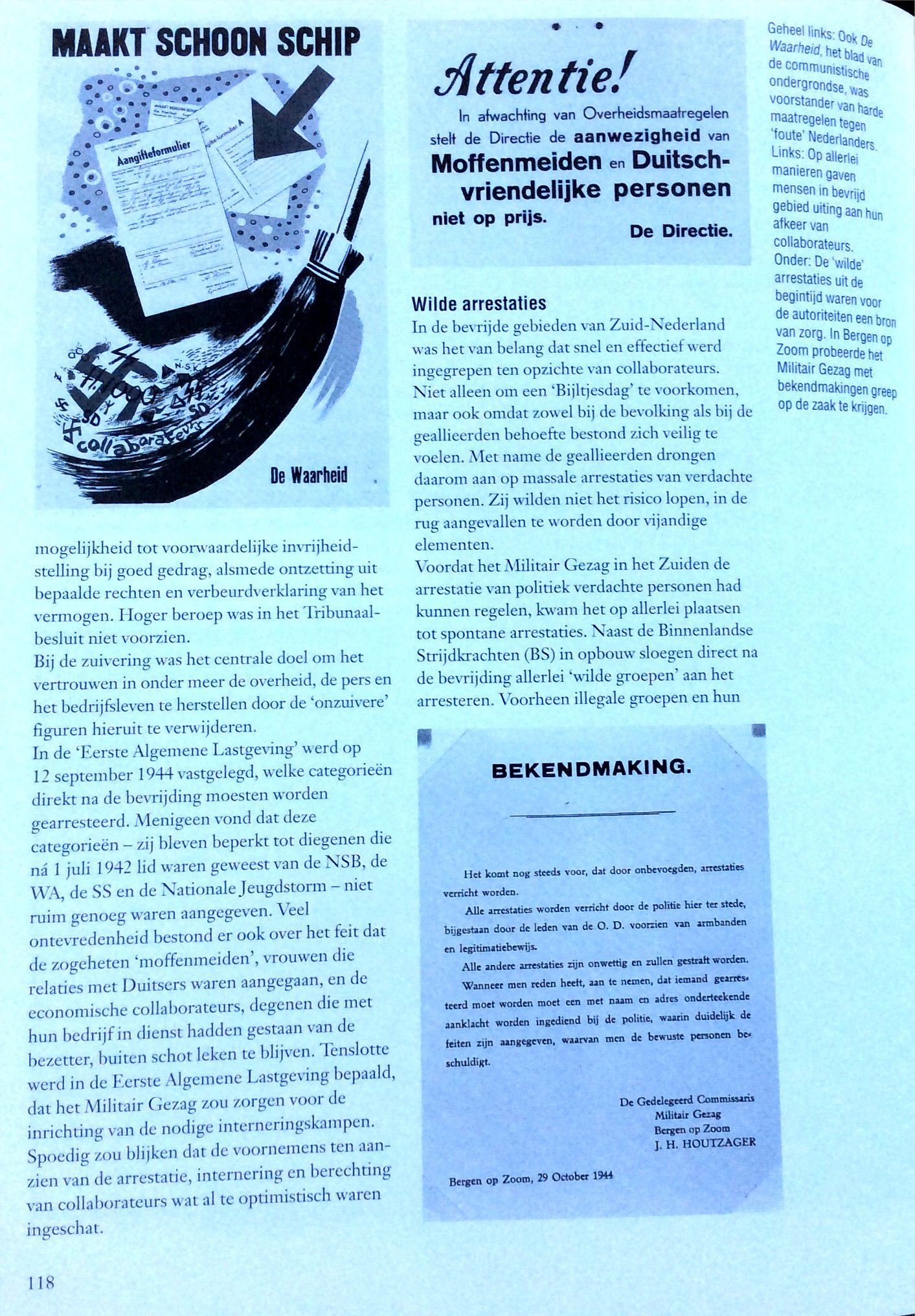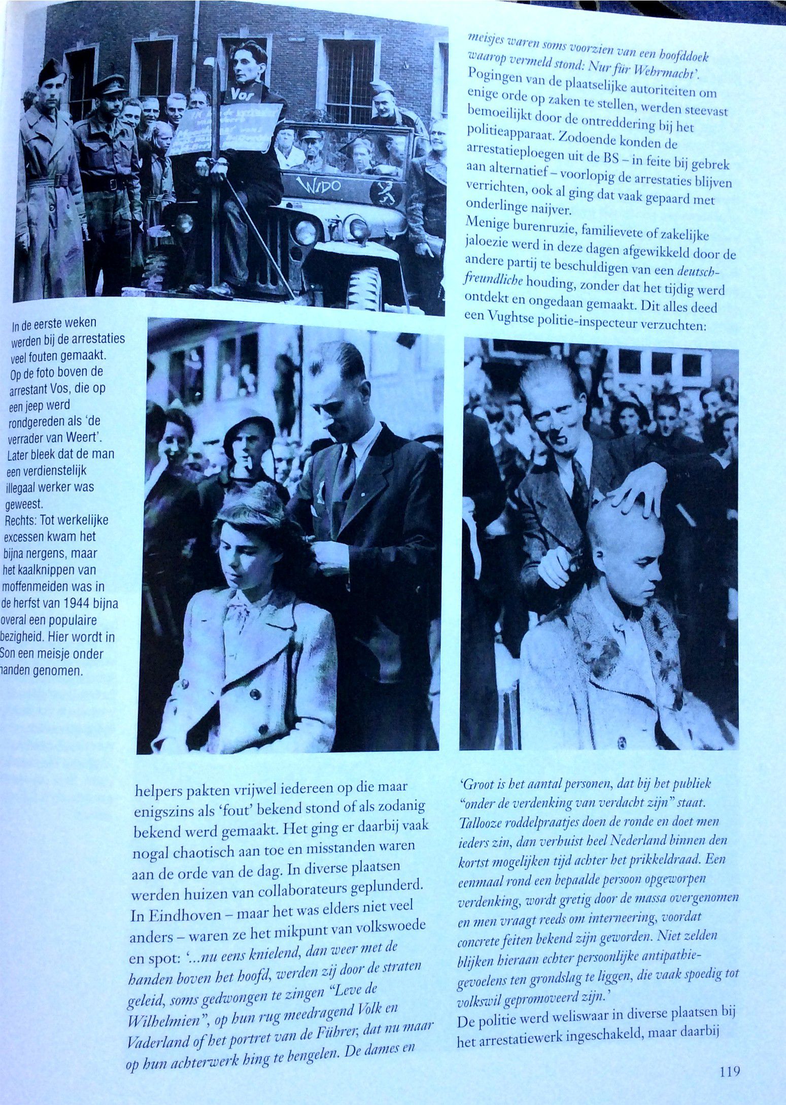 Het eerste wat de menschen deden toen ze zeker wisten dat ‘t Duitsche gezag verslagen was, was meisjes mishandelen die het steeds met de Duitschers eens geweest waren. Zij knipten hun ‘t haar af, of rukten het wel uit ook en lieten ze, de door Duitschers bevuilde woonhuizen schoonmaken. ‘t Was een jammerlijke vertooning. Wie dacht aan wraak op de N.S.B ers, er was al zoo lang geroepen over “bijltjesdag”. Dat was ‘t enig toegestane wapen, de bijl. En daarmee zou wraak genomen worden op de N.S.B ers, op een bloedige wijze. Maar neen, men wreekte zich op weerloze meisjes. Zou dat komen omdat de N.S.B.’ers nog gewapend waren en die meisjes niet. Alzoo blijkt wel dat de Ordedienst goed werk zal kunnen doen. In Mill is dit ook aan de orde geweest !