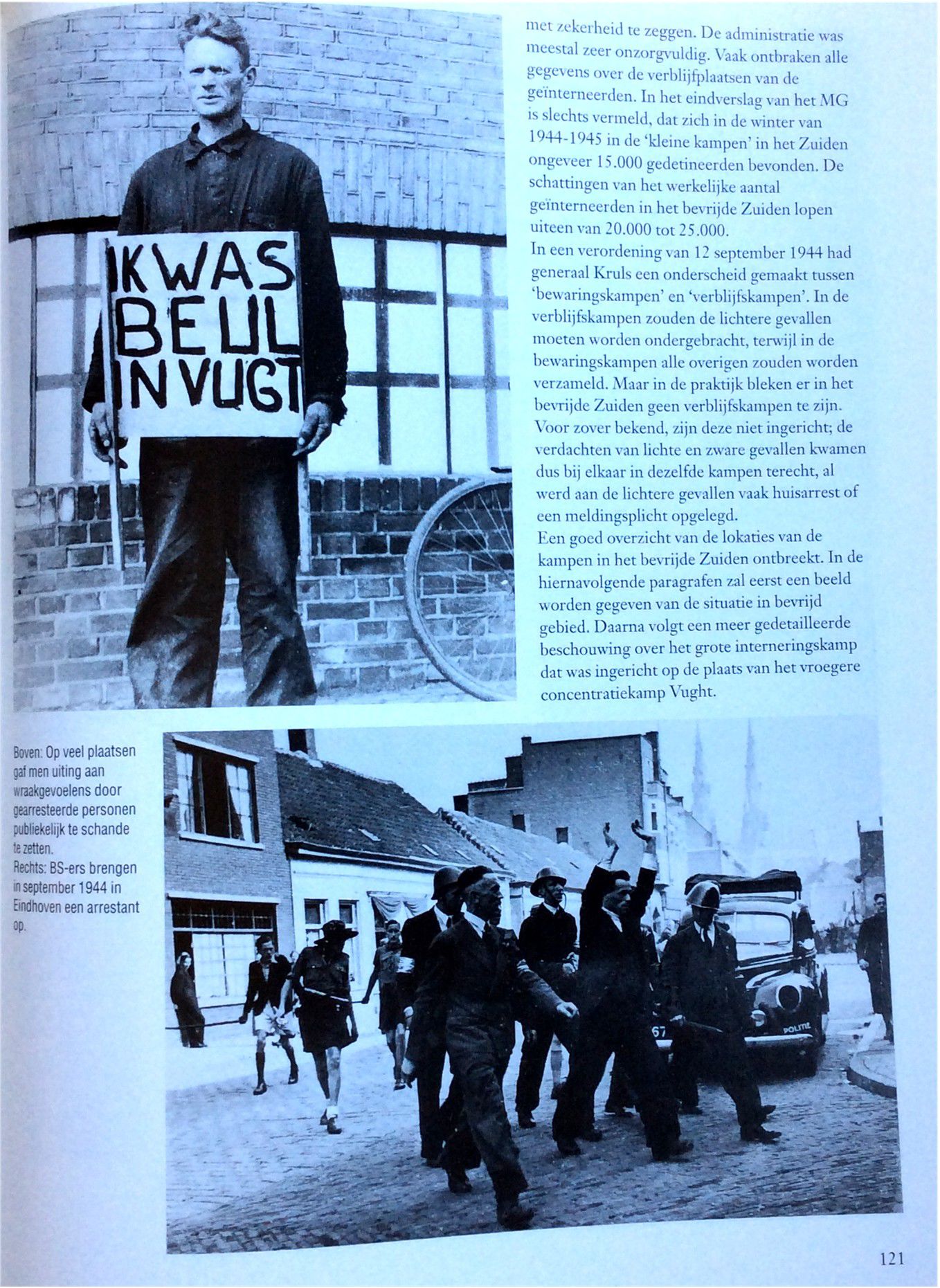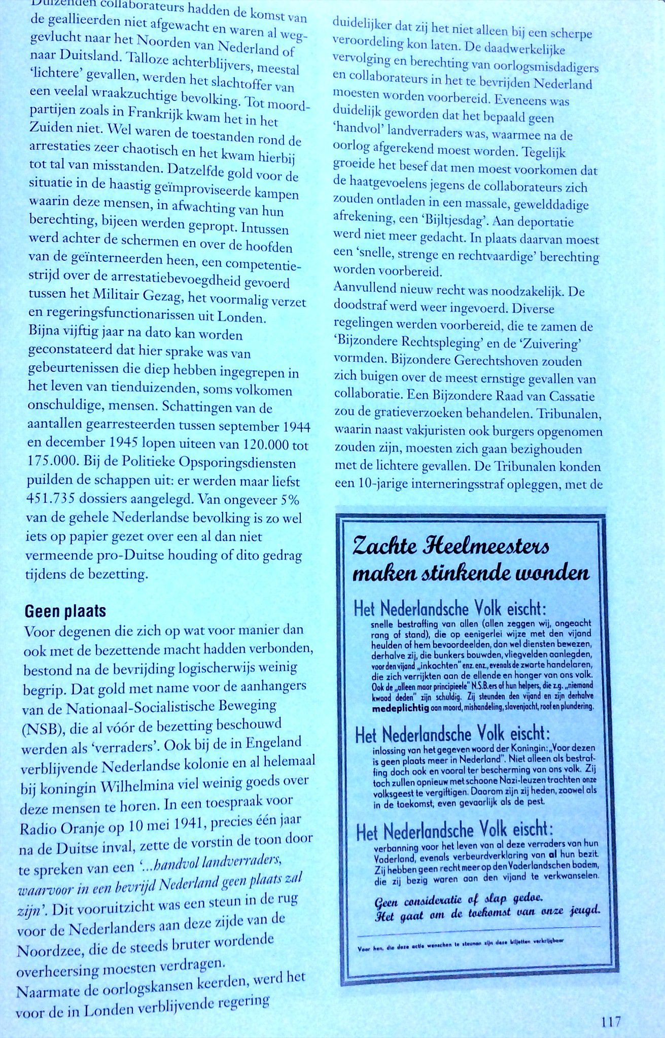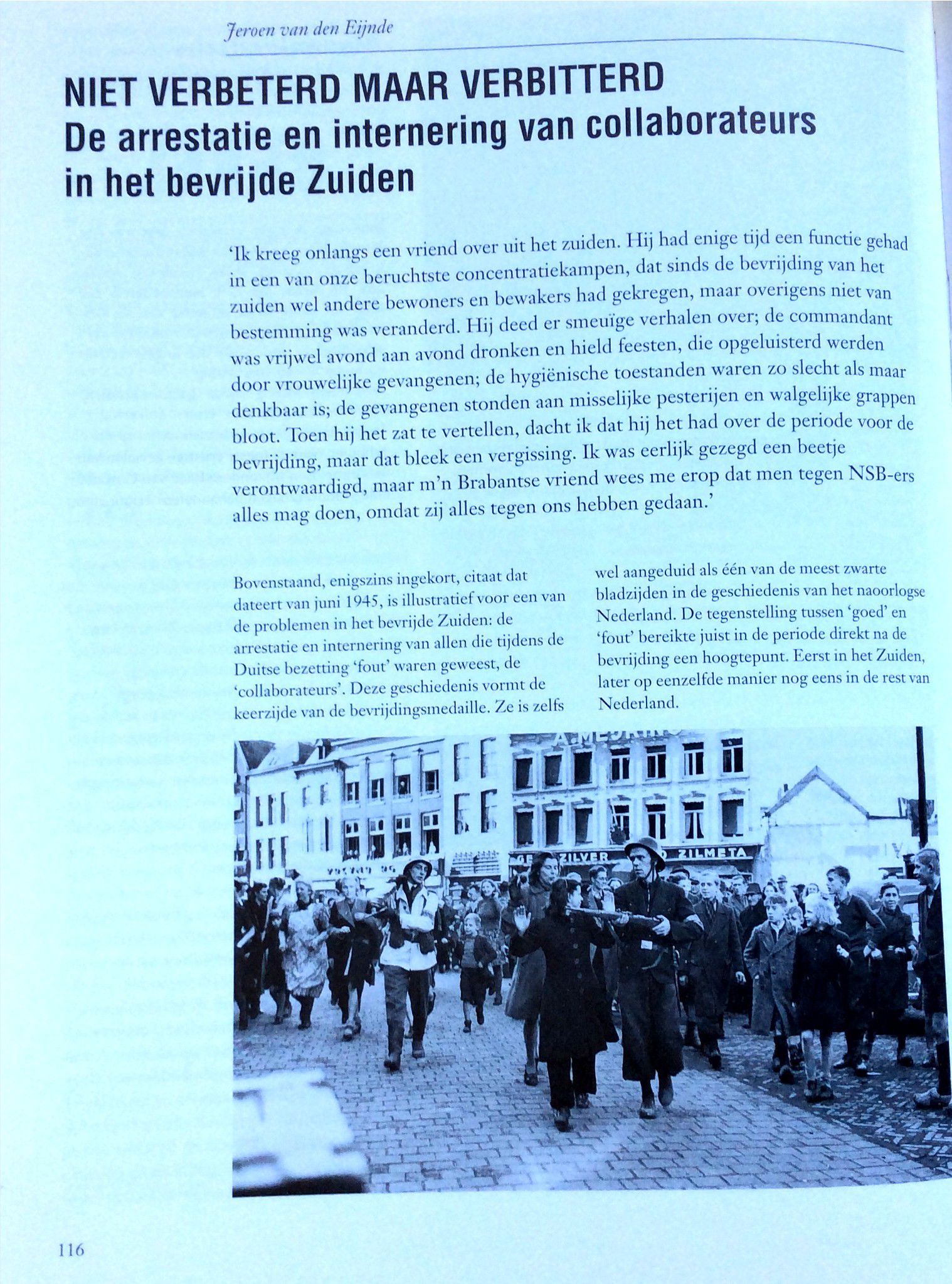 Het eerste wat de menschen deden toen ze zeker wisten dat ‘t Duitsche gezag verslagen was, was meisjes mishandelen die het steeds met de Duitschers eens geweest waren. Zij knipten hun ‘t haar af, of rukten het wel uit ook en lieten ze, de door Duitschers bevuilde woonhuizen schoonmaken. ‘t Was een jammerlijke vertooning. Wie dacht aan wraak op de N.S.B ers, er was al zoo lang geroepen over “bijltjesdag”. Dat was ‘t enig toegestane wapen, de bijl. En daarmee zou wraak genomen worden op de N.S.B ers, op een bloedige wijze. Maar neen, men wreekte zich op weerloze meisjes. Zou dat komen omdat de N.S.B.’ers nog gewapend waren en die meisjes niet. Alzoo blijkt wel dat de Ordedienst goed werk zal kunnen doen. In Mill is dit ook aan de orde geweest !
