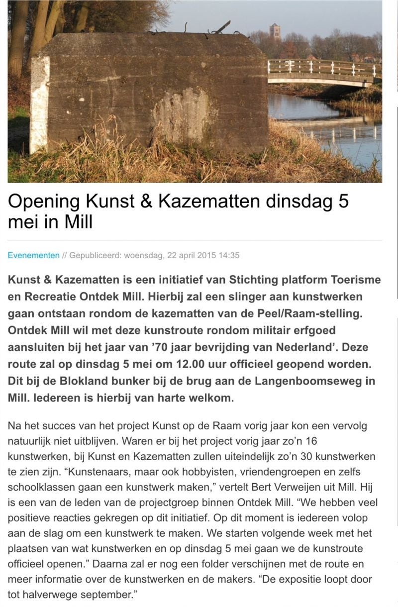 Hier beneden bijzonderheden omtrent de Opening van "Kunst & Kazematten" op 5 mei 2015 om 12:00 uur aan de Langenboomseweg bij de Blokland Bunker door de Burgemeester van Mill dhr. ing. Antoine Walraven als Voorzitter van de Stichting "Sporen van de Oorlog". Er zijn 32 Kazematten Symbolisch versierd door 32 Kunstenaars uit de Gemeente Mill. Zie voor meer bijzonderheden op de Pagina "Kunstenaars".