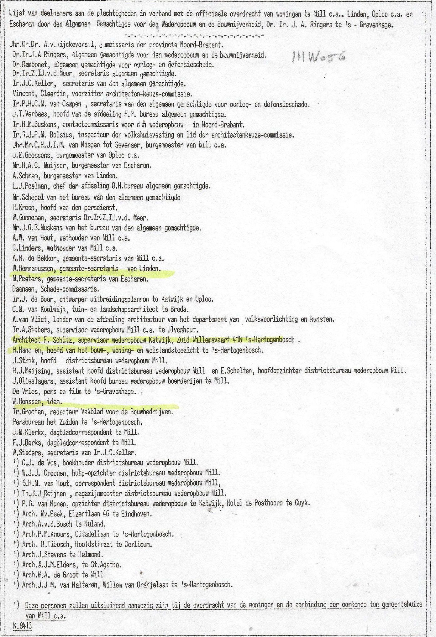 Hier beneden een lijst van 1956 over de officiële overdracht van de opgeknapte woningen i.v.m. de Wederopbouw. Hier lag ook een link naar de "Arbeidseinsatz" in 1940.