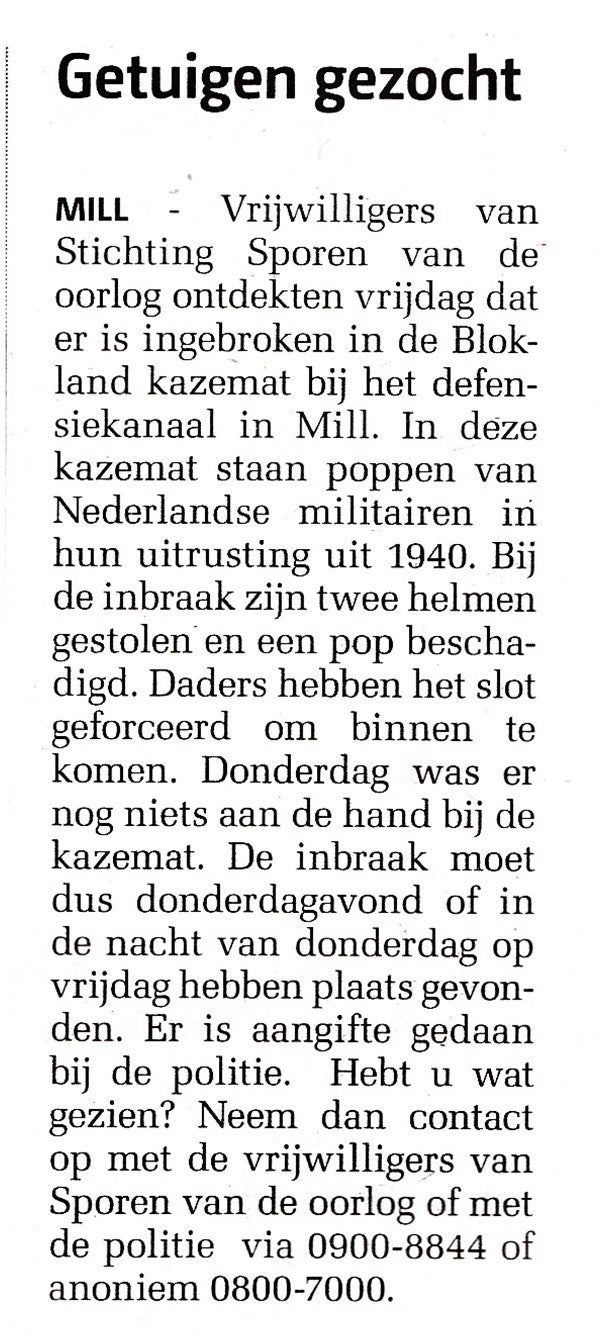 Hier beneden een Artikel dd. 21 april 2015 in de KoerierMill.nl over het Bewaken van de Sporen van de Oorlog door de Stichting "Sporen van de Oorlog" in Mill. Beneden op de Foto staat dhr. Willy Sweens, bestuurslid van de Stichting Sporen van de Oorlog.