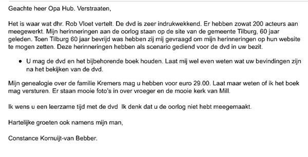 Hier beneden al vast een gedeelte van Verhalen over de Bevrijding van Mill door Dhr. Willem van Bebber. Dhr. Willem van Bebber was de vader van de vrouw van Antoon Kremers, dus de schoonvader van Dhr. Antoon Kremers uit Mill ( Tontje Suuker ). Er komt in 2013 een nieuw Boek uit van Mevr. Constance Kornuijt-van Bebber, een Kleinkind van dhr. Willem van Bebber.Dit Boek heeft Mevr. Constance Kornuijt-van Bebber als titel gegeven: "Genealogie familie Kremers". Het is nu, Oktober 2013, klaar en Mevr. Constance Kornuijt-van Bebber komt het Boek waarschijnlijk dit jaar nog persoonlijk naar Myllesheem in Mill brengen. Het Boek is te krijgen voor € 29,50. Zie enkele verhalen uit dit Boek op de Pagina Sporen van de Oorlog.