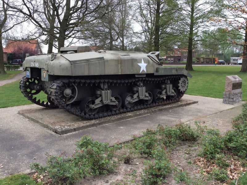 Hier beneden staat aan de Langenboomseweg in Mill een Sherman-Tank de "Ram Kangaroo" van de Geallieerden die symbool staat voor de oorlogshandelingen van 1944 tot 1945.