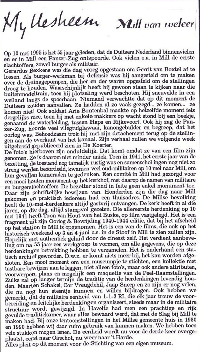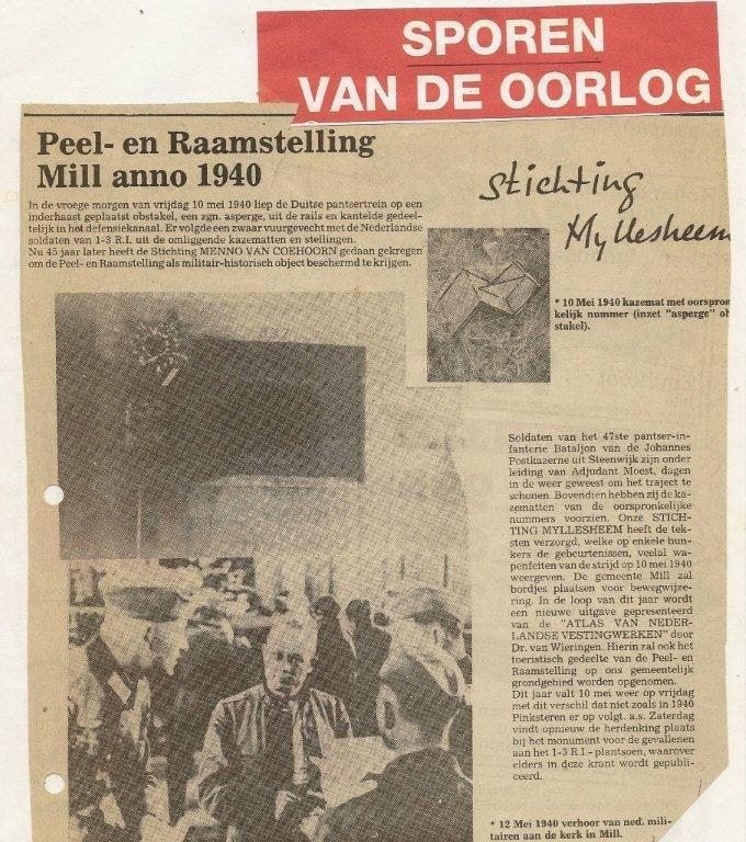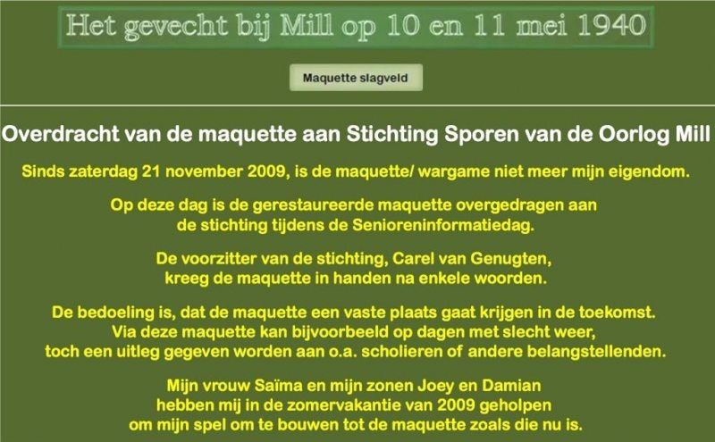 Dhr. Ludwig van Dijk, bestuurslid van de Stichting Sporen van de Oorlog, heeft ook een prachtige Website van de Oorlog over het gevecht bij Mill van 10 mei 1940 tot 11 mei 1940 en wel op: