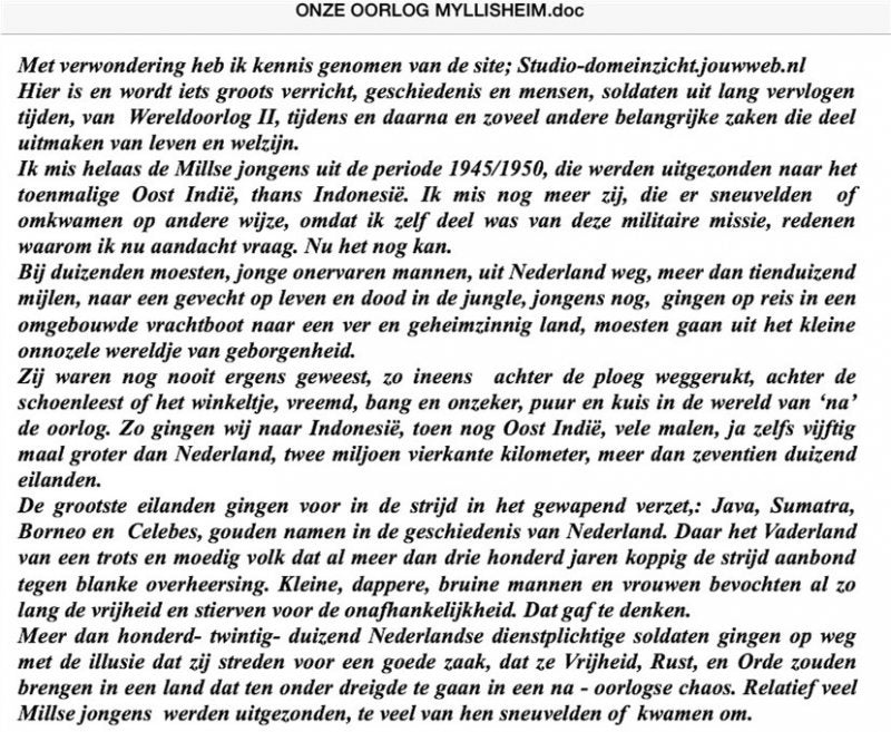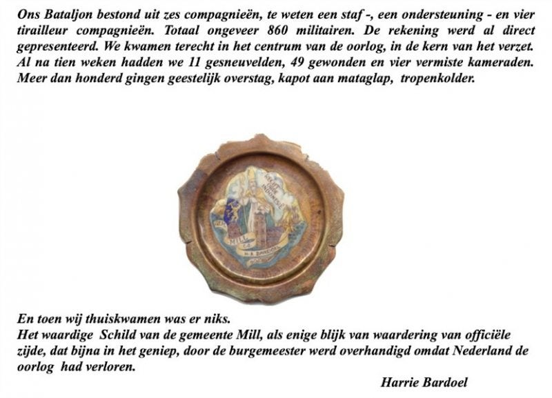 Een Hartelijk Dank van Studio Domeinzicht voor dhr. Harrie Bardoel ( en ik denk ook voor veel meer jonge Militairen ( en hun Familie ) uit Nederland en Mill, die in die tijd zelf ook betrokken zijn geweest bij de Politionele Akties enz. in Indië. Ook dank aan dhr. Harrie Bardoel voor zijn emotionele verhaal over hem zelf en o.a. de Millse Jongens, die in Indonesië alles hebben gegeven om van Soekarno te winnen en om Nederlands-Indië voor Nederland te behouden. Toen ze in Nederland en in Mill terugkwamen kregen ze geen enkele blijk van waardering en Medeleven. Alles moest doodgezwegen worden. Nederland had verloren en Indonesië behield zijn onafhankelijkheid.