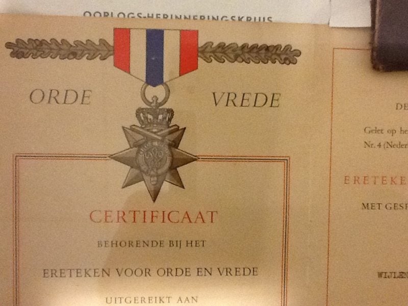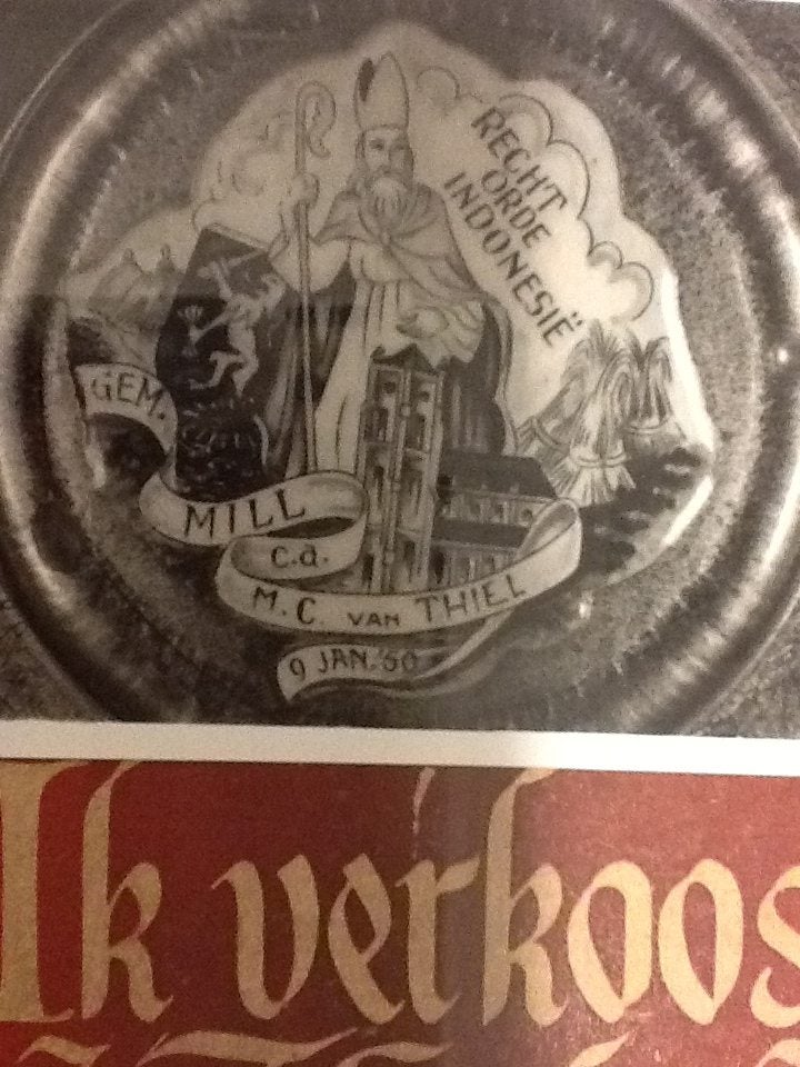 Deze ingelijste Foto van Recht Op Orde in Indonesië van Het Koninklijk Nederlands Indonesisch Leger het "K.N.I.L." van dhr. M.C. van Thiel uitgereikt door de Gemeente Mill c.a. in 1950 ligt bij Myllesheem in Myllesweerd.