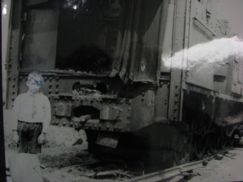 Oorlogsschade Trein Mill 1940. De Heren Wim Vloet, Pietje van Abel en Thijn de Klein staan hier bij de Trein.