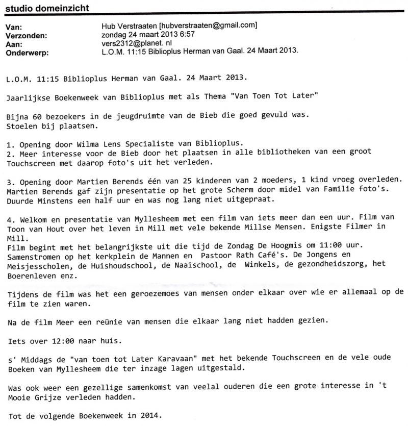 De Website "Studio-Domeinzicht.jouwweb.nl heeft Hub. Verstraaten opgestart op 17 mei 2011 voor de Heemkundestichting "Myllesheem", omdat Myllesheem toen nog geen Website had. Hub.Verstraaten heeft de naam "Studio Domeinzicht" gekozen omdat de Domeinenstraat waar hij aan woont grenst aan grondeigendommen van het KROONDOMEIN. ( eind 2012 De Groespeel genoemd ). Studio-Domeinzicht is een studie van Oud Mill met vele oude Ansichten, foto's, Krantenartikelen en veel info over het rijke verleden van Mill. Ook staan er enkele hedendaagse foto's onder aan de Pagina's om te laten zien wat er van het Mooie Rijke Verleden van Mill ( met veel Groen en vele prachtige oude Boerderijen en Panden ) terecht is gekomen.