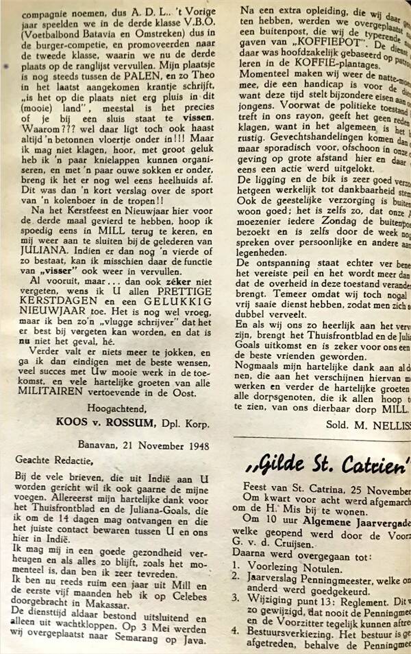 Hier beneden bijzonderheden over de geschiedenis van Mill c.a. .Het boek JULIANA-GOALS is een Samenvatting van Verhalen, advertenties, overlijdens, geboortes, Huwelijken, 40 Indië-gangers uit Mill, oprichting Verkennerij, Millse verenigingen, het geroddel van CIS en HAS ( beide Kremers ) enz. enz. Honderden Pagina's van 1945 tot 1950. Er bestaan maar 4 boeken !