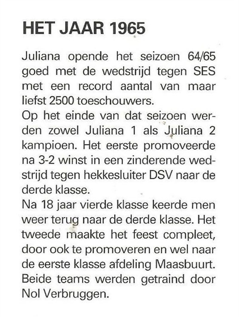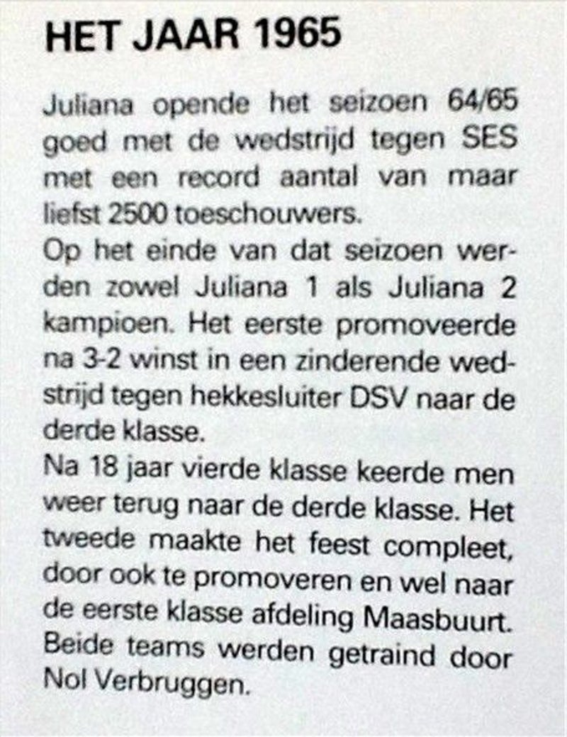 Bronvermelding beneden: Uit het Boek over het 75 Jarig bestaan van de Millse Voetbalclub Juliana pg. 84.